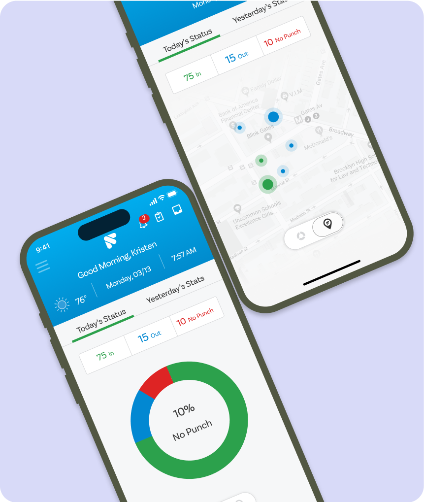 Clock in via app, fingerprint, SMS, or facial recognition — instantly synced.